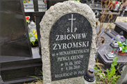 ŻYROMSKI Zbigniew [16B-3G-28], urodzony 19.06.1930 r. w Monasterzyskach. Człowiek skromny, niezwykle uczciwy i koleżeński. Aktywny działacz organizacji kresowych. Wydał następujące publikacje: „Miasto kresowe Monasterzyska wczoraj i dziś”; „Historia jednej kresowej rodziny: rodowód Żyromskich przydomek Chwalibóg na tle dziejów miasta Monasterzyska”; „Miasto kresowe Monasterzyska: cmentarz katolicki”; „Obchody Święta Konstytucji i pochód 3 maja 1946 roku w Krakowie oraz mój w nim udział”. W gościnnych progach wrocławskiego Klubu Muzyki i Literatury 14.09.2017 r. miało miejsce wręczenie Zbigniewowi Żyromskiemu – jako niestrudzonemu piewcy i dokumentaliście Kresów Południowo-Wschodnich, zwłaszcza położonych na Podolu miejscowości z rejonów Buczacza i Monasterzysk – szczególnego odznaczenia „Pierścienia Milenijnego”. W ten sposób dołączył On do grona kilkunastu osób z dziennikarskiego środowiska, które dostąpiły tego zaszczytu. Zmarł 9.06.2018 r. (Źródło: przyjaciele z Towarzystwa Miłośników Lwowa i Kresów Południowo-Wschodnich, Oddział Buczacz)